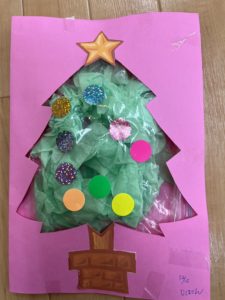 12月半ばとなり、クリスマスが近づいてきました。子どもたちは、松ぼっくりやフラワーペーパーなどの素材を利用したクリスマスツリーを作りました。みんな喜んでお持ち帰りしました。クリスマス、サンタさんのプレゼントが届くといいですね。