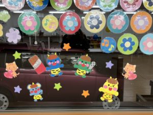 事業所の窓にかわいい鬼さんたちが登場したり、大きな口を開けた赤鬼さんが支援ルームにど~んと居座ったりしています。