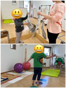 上の写真は、「新聞紙びりびり」をやっています。紙やぶりでは、いろいろな感覚情報(聴覚刺激、触覚刺激、視覚刺激、固有覚など)が得られ、手先の発達や手先を動かすスキルを高める活動になります。破った新聞紙を集めて舞い上げ、楽しく遊ぶ姿も見られました。
