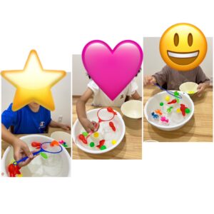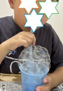 コップに入ったシャボン液をストローでぶくぶくして、シャボン玉をつくりました。みんな、盛り上がってくるシャボン玉に大興奮!