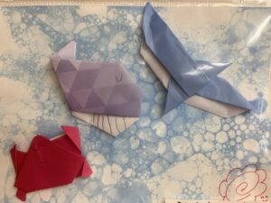 色紙で折った海の生き物やはさみでチョキチョキ切った海の生き物が気持ちよさそうに泳ぎだしました!