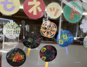 子どもたちの作品は、あどびぃ入り口横のガラスをきれいに彩ってくれています。