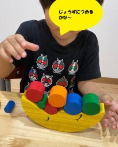 円柱形の積み木を、月型の土台の上に落とさないように積んでいきます。ゲーム的な要素を強めて、次はどの色の積み木を積むかサイコロをふって決めたりもします。
