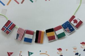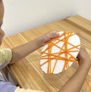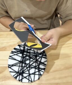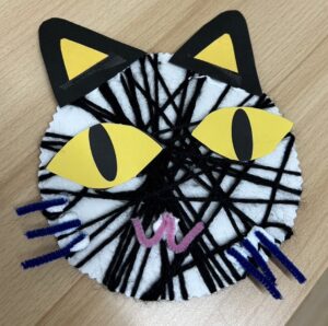 子どもたちが、切ったり、巻いたり、貼ったりして作った「かぼちゃ」や「黒猫」が待ってますよー!