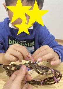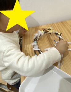 リースは、さつまいものつるで作ったリースベースに、子どもたちがいろいろな飾りをつけて作っています🎅
