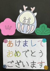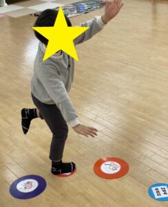 お正月の遊びでよくやる「すごろく」をフロア―いっぱいに広げてできるようにして、楽しんでいます(^^)