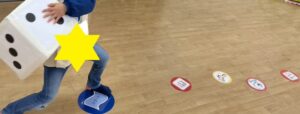 大きなサイコロを両手で持ち全身を使って転がしたり、止まったコマに書いてある指示に従って片足立ちや両足ジャンプをしたりして運動不足の解消にもなりました。