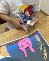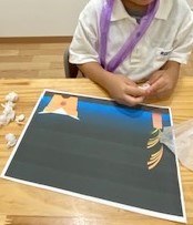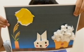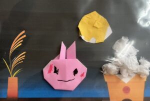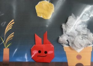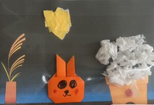 子どもたちも、折り紙でうさぎを折ったり、紙を丸めてお団子を作ったりして「十五夜」にちなんだ作品を作りました。
