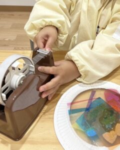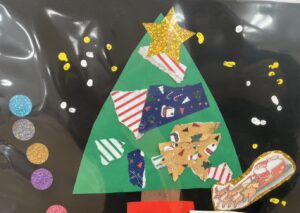 紙皿の真ん中をくりぬき、透明シートにツリーやトナカイ、サンタさんを描いたり