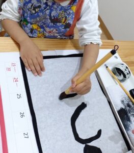 年中さんや年長さんは、筆で「うま」と上手に書き上げ