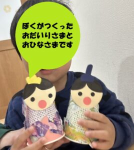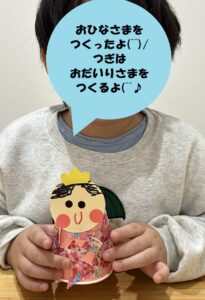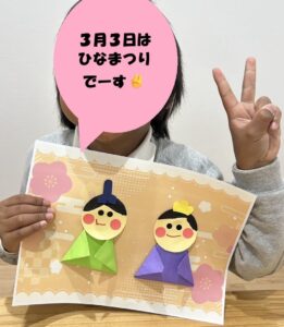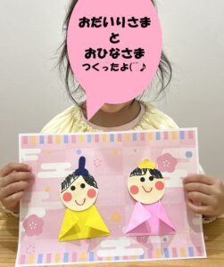 2026年2月19日 / 最終更新日時 : 2026年2月19日 愛知こどもネット あどびぃ お知らせ 3月3日は「ひな祭り」です🎎 もうすぐ「ひな祭り」🎎 工作で、「おだいりさま」や「おひなさま」のかざりをつくりました(^^)/ 折り紙を折ったり、紙をちぎって貼ったり、綿に飾りを付けたりしました(^O^) みんな、上手にできましたね(*^^)v