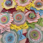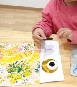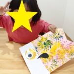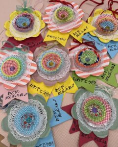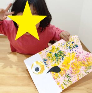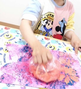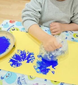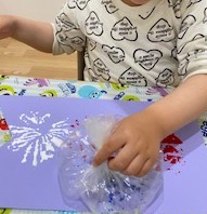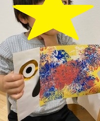 絵の具の好きな色を使って、袋スタンプでポンポンしました(^^♪